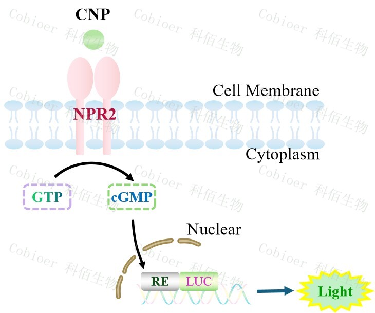 NPR2 Effector Reporter Cell 報(bào)告基因藥靶模型很好的模擬了體內(nèi) NPR2 的信號(hào)轉(zhuǎn)導(dǎo)過(guò)程,原理見(jiàn)下圖所示。![]() Figure 1. NPR2 Effector Reporter Cell 細(xì)胞模型原理圖