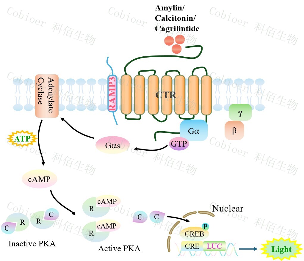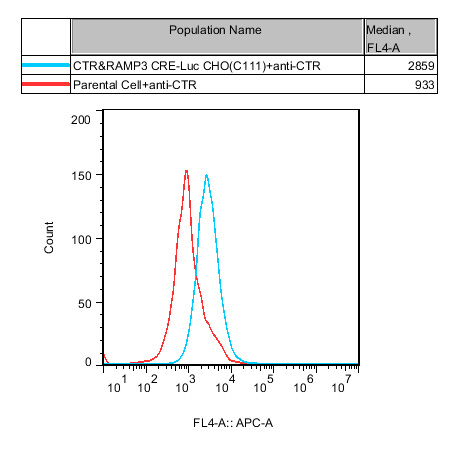CTR&RAMP3 CRE-Luc CHO 報(bào)告基因藥靶模型很好的模擬了體內(nèi) CTR&RAMP3 的信 號轉(zhuǎn)導(dǎo)過程,原理見下圖所示。![]() Figure 1. CTR&RAMP3 CRE-Luc CHO 細(xì)胞模型原理圖 |