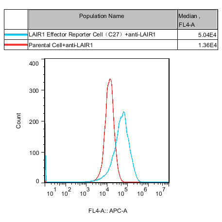 ![]() Figure 2. Recombinant LAIR1 Effector Reporter Cell stably expressing LAIR1. ![]() Figure 3. Dose Response of LAIRl Agonist Ab in LAIR1 Effector Reporter Cell(C27). |