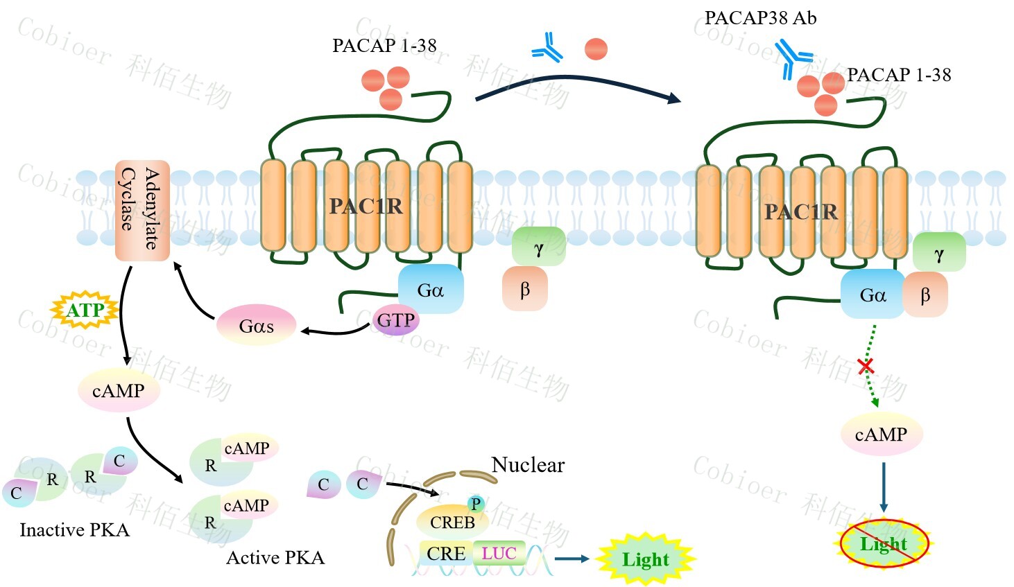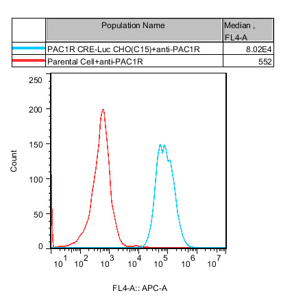 PAC1R CRE-Luc CHO 報(bào)告基因藥靶模型很好的模擬了體內(nèi) PAC1R 的信號轉(zhuǎn)導(dǎo)過程, 原理見下圖所示。![]() Figure 1. PAC1R CRE-Luc CHO 細(xì)胞模型原理圖 |