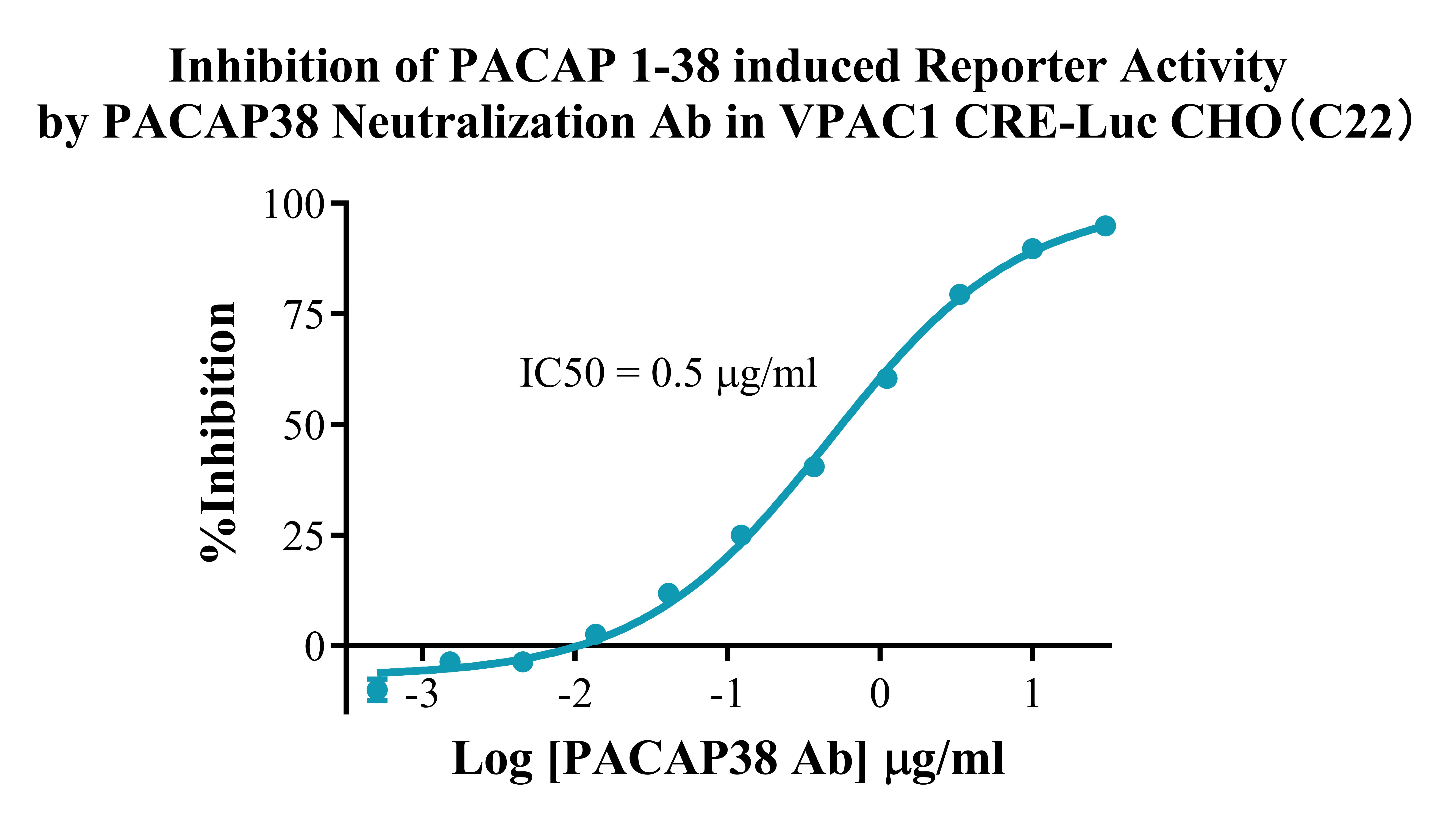Figure 3.Inhibition of PACAP 1-38 induced Reporter Activity by PACAP38 Neutralization Ab in VPAC1 CRE-Luc CHO(C22).