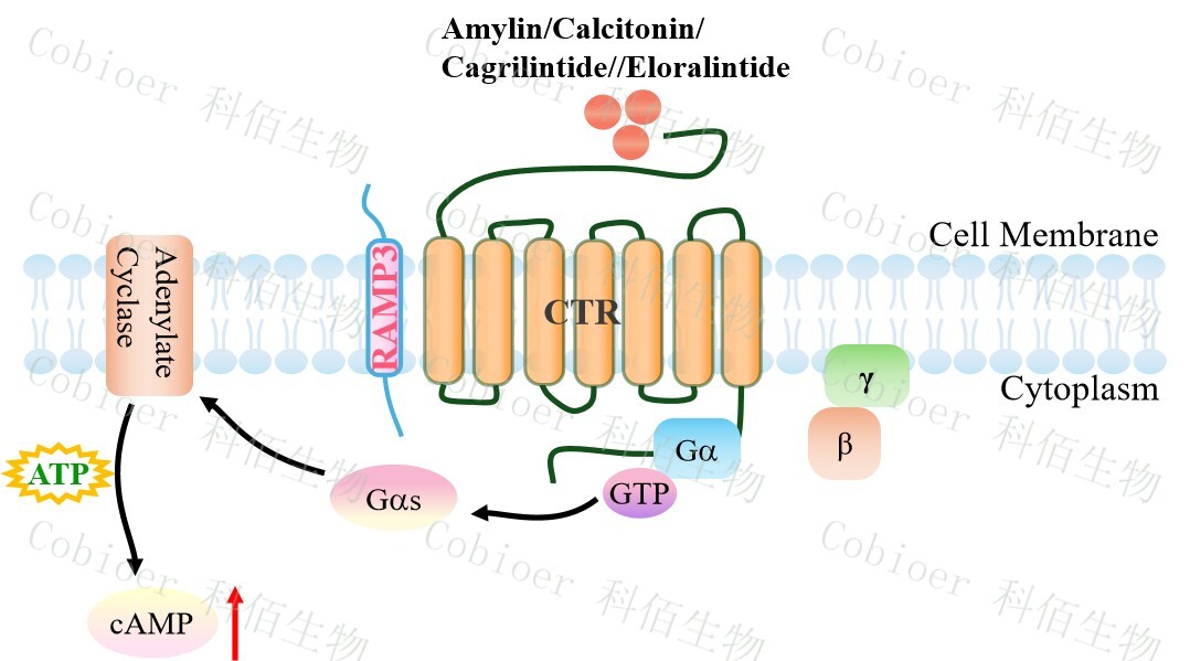 | 降鈣素基因相關肽(CGRP)家族包括 CGRP 本身、降鈣素(CT)、腎上腺髓質(zhì)素 (AM)和胰島淀粉樣肽(AMY)。 胰淀素(Amylin)受體的三種類型的已被確定,即 AMY1,AMY2 和 AMY3。胰淀素 受體屬于 B 類 GPCR,是異二聚體復合物,由降鈣素受體(CTR)與受體活性修飾蛋白 (RAMPs)結(jié)合形成。該受體的 CTR 組分具有相同的 GPCR 結(jié)構:7 個跨膜相互連接的α- 螺旋,將細胞外信號傳遞到細胞內(nèi)細胞質(zhì)信號級聯(lián)。RAMP 有三種類型(RAMP1、 RAMP2 和 RAMP3),它們共享 31%的氨基酸序列,具有相似的基本結(jié)構。RAMP 是將 CTR 轉(zhuǎn)運到細胞膜并調(diào)節(jié)其配體特異性的重要肽,它可以改變特定 GPCR 的藥理學、功能 和細胞運輸。 哺乳動物細胞中 Amylin 受體的激活已被證明可以提高 cAMP,并被認為與 Gs 蛋白和 腺苷酸環(huán)化酶的刺激有關。在 RAMPs 的存在下,其與胰淀素的結(jié)合親和力可以被修飾。 CTR 和 RAMP1 或 CTR 和 RAMP3 的異質(zhì)結(jié)構被認為有利于與胰淀素結(jié)合,介導大腦中的 生理功能。AMY3 的激活刺激 G 蛋白 Gαs,進一步控制腺苷酸環(huán)化酶(AC),隨后增加細 胞 cAMP。cAMP 與 PKA 調(diào)控亞基(R2)的結(jié)合誘導 PKA 四聚體全酶解離,導致 PKA 催 化亞基的激活。cAMP 激活的 PKA 參與調(diào)控 ERK1/2 的活性。ERK1/2 通路的觸發(fā)可能導致 Ca 2+分布不均勻,引發(fā)內(nèi)質(zhì)網(wǎng)和線粒體功能障礙,導致細胞死亡。此外,cAMP 刺激 AKT 進一步導致轉(zhuǎn)錄因子 cFos 的表達。 |