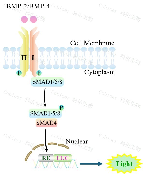 BMP Effector Reporter Cell 報(bào)告基因藥靶模型很好的模擬了體內(nèi) BMP 的信號轉(zhuǎn)導(dǎo)過程, 原理見下圖所示。![]() Figure 1. BMP Effector Reporter Cell 細(xì)胞模型原理圖 |