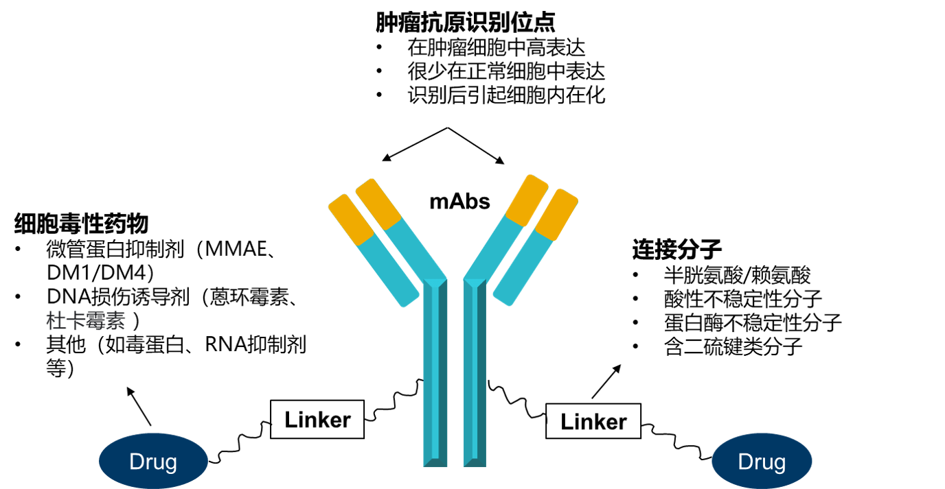 ADC(Antibody-drug conjugate,ADC)藥物全稱為抗體偶聯(lián)藥物,是將抗體通過偶聯(lián)臂(Linker)與小分子藥物(Payload)共價(jià)連接的復(fù)合物。抗體負(fù)責(zé)靶向病灶,毒素通過自身特性殺傷目標(biāo)細(xì)胞,連接子則是承擔(dān)橋接毒素和抗體直至ADC到達(dá)腫瘤細(xì)胞內(nèi)再進(jìn)行釋放的功能。一個(gè)理想的ADC分子應(yīng)該具備高靶點(diǎn)特異性、高腫瘤殺傷能力、長藥代特性、低免疫原性、低脫靶毒性。