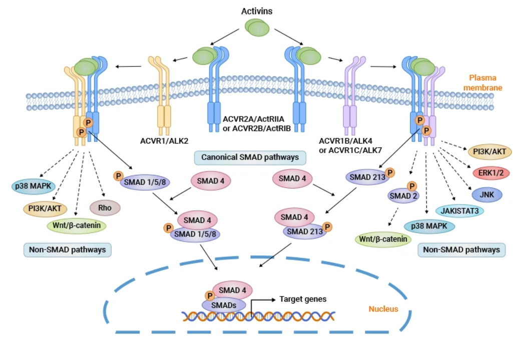 Activin A是一種約25 kDa的細(xì)胞因子,可通過(guò)二硫鍵與βA和/或 βB 亞基連接形成同源二聚體或異二聚體。Activin A通過(guò)兩個(gè)I型和兩個(gè)II型受體發(fā)出信號(hào),配體結(jié)合后,組裝最終的受體復(fù)合物。I型受體包括激活素受體1A型(或激活素受體樣激酶2,ALK2)、激活素受體1B型(或ALK4)和激活素受體1C型(或ALK7)。II型受體(ActRII)分為激活素受體IIA型(ACVR2A)和激活素受體IIB型(ACVR2B)。